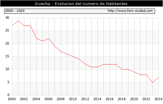 el numero de habitantes en Iruecha era de 7, 2 habitantes mas que el en el año 2023. En el grafico siguiente se puede ver cuantos habitantes tiene Iruecha a lo largo de los años.