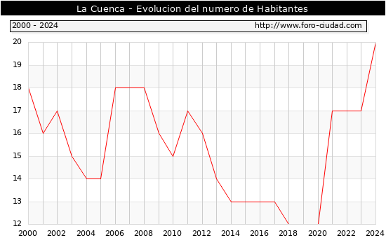 el numero de habitantes en La Cuenca era de 20, 3 habitantes mas que el en el año 2023. En el grafico siguiente se puede ver cuantos habitantes tiene La Cuenca a lo largo de los años.