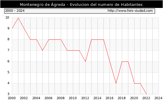 el numero de habitantes en Montenegro de Ágreda era de 3, igual numero de habitantes que el en el año 2023. En el grafico siguiente se puede ver cuantos habitantes tiene Montenegro de Ágreda a lo largo de los años.