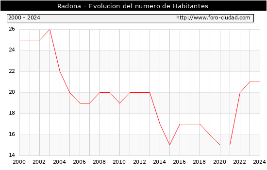 el numero de habitantes en Radona era de 21, igual numero de habitantes que el en el año 2023. En el grafico siguiente se puede ver cuantos habitantes tiene Radona a lo largo de los años.