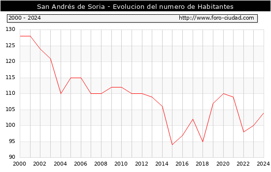 el numero de habitantes en San Andrés de Soria era de 104, 4 habitantes mas que el en el año 2023. En el grafico siguiente se puede ver cuantos habitantes tiene San Andrés de Soria a lo largo de los años.