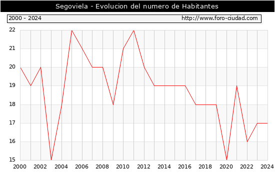 el numero de habitantes en Segoviela era de 17, igual numero de habitantes que el en el año 2023. En el grafico siguiente se puede ver cuantos habitantes tiene Segoviela a lo largo de los años.