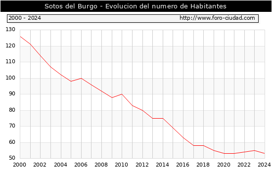 el numero de habitantes en Sotos del Burgo era de 53, 2 habitantes menos que el en el año 2023. En el grafico siguiente se puede ver cuantos habitantes tiene Sotos del Burgo a lo largo de los años.