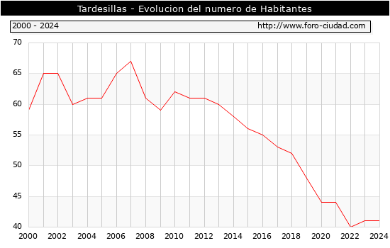 el numero de habitantes en Tardesillas era de 41, igual numero de habitantes que el en el año 2023. En el grafico siguiente se puede ver cuantos habitantes tiene Tardesillas a lo largo de los años.