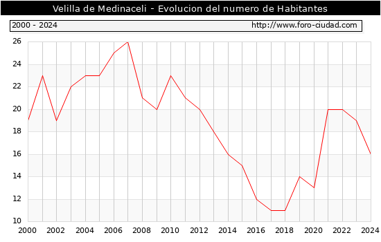 el numero de habitantes en Velilla de Medinaceli era de 16, 3 habitantes menos que el en el año 2023. En el grafico siguiente se puede ver cuantos habitantes tiene Velilla de Medinaceli a lo largo de los años.