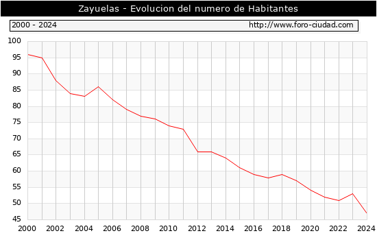 el numero de habitantes en Zayuelas era de 47, 6 habitantes menos que el en el año 2023. En el grafico siguiente se puede ver cuantos habitantes tiene Zayuelas a lo largo de los años.