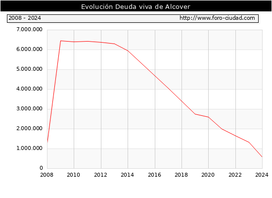 Alcover - Deuda viva del Ayuntamiento a 31/12/2024 Alcover - Deuda viva del Ayuntamiento a 31/12/2024 Segun el Ministerio de Economia y Hacienda el Ayuntamiento de Alcover a 31/12/2024 posee una deuda de 582.000 € . La deuda viva a 31/12/2023 ascendia a 1.332.000 € por lo que en el ultimo año la deuda se redujo en -750.000 €. ![]()