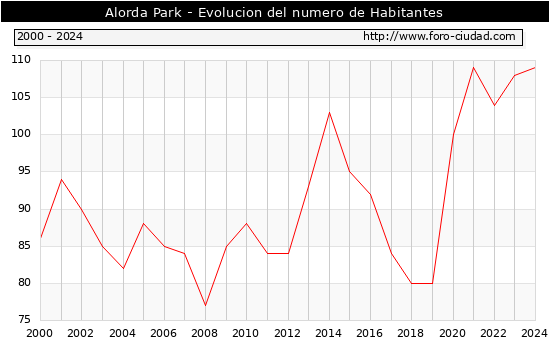 el numero de habitantes en Alorda Park era de 109, 1 habitantes mas que el en el año 2023. En el grafico siguiente se puede ver cuantos habitantes tiene Alorda Park a lo largo de los años.
