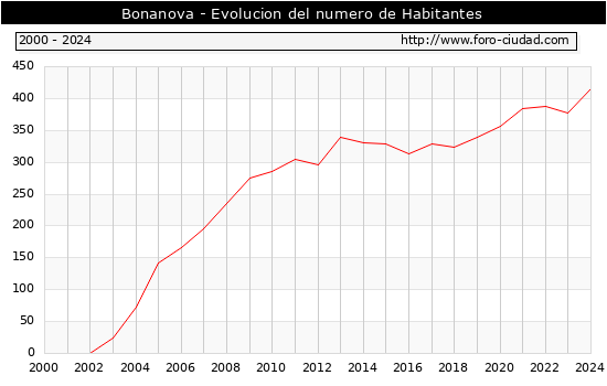 el numero de habitantes en Bonanova era de 415, 37 habitantes mas que el en el año 2023. En el grafico siguiente se puede ver cuantos habitantes tiene Bonanova a lo largo de los años.