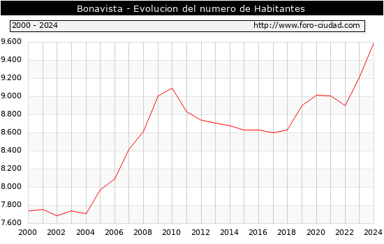 el numero de habitantes en Bonavista era de 9.589, 383 habitantes mas que el en el año 2023. En el grafico siguiente se puede ver cuantos habitantes tiene Bonavista a lo largo de los años.