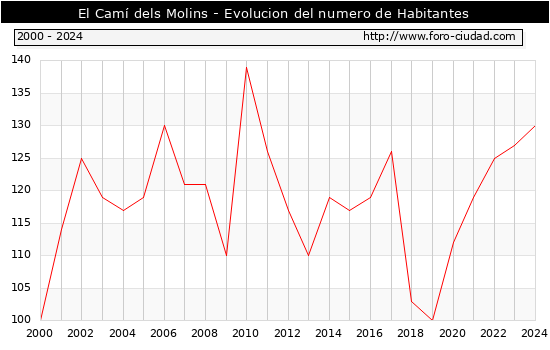 el numero de habitantes en El Camí dels Molins era de 130, 3 habitantes mas que el en el año 2023. En el grafico siguiente se puede ver cuantos habitantes tiene El Camí dels Molins a lo largo de los años.