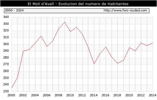 el numero de habitantes en El Molí d'Avall era de 302, 4 habitantes mas que el en el año 2023. En el grafico siguiente se puede ver cuantos habitantes tiene El Molí d'Avall a lo largo de los años.