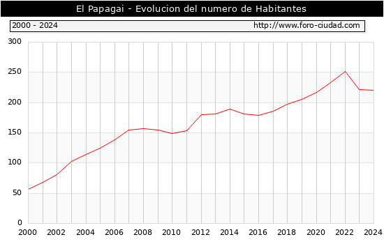 el numero de habitantes en El Papagai era de 220, 2 habitantes menos que el en el año 2023. En el grafico siguiente se puede ver cuantos habitantes tiene El Papagai a lo largo de los años.