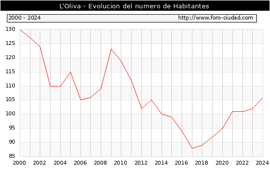 el numero de habitantes en L'Oliva era de 106, 4 habitantes mas que el en el año 2023. En el grafico siguiente se puede ver cuantos habitantes tiene L'Oliva a lo largo de los años.