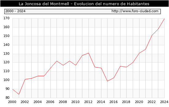 el numero de habitantes en La Joncosa del Montmell era de 170, 12 habitantes mas que el en el año 2023. En el grafico siguiente se puede ver cuantos habitantes tiene La Joncosa del Montmell a lo largo de los años.