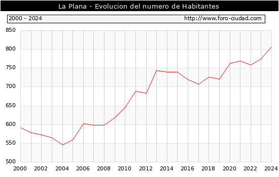 el numero de habitantes en La Plana era de 807, 32 habitantes mas que el en el año 2023. En el grafico siguiente se puede ver cuantos habitantes tiene La Plana a lo largo de los años.