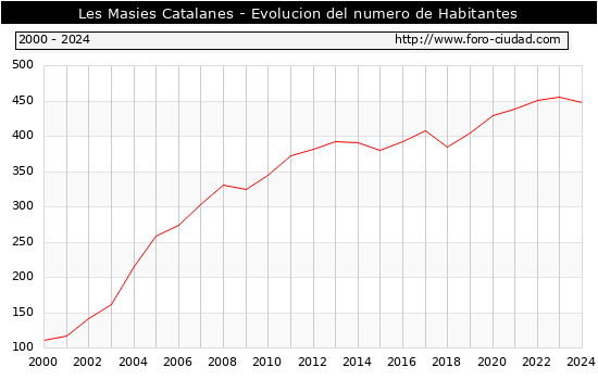 el numero de habitantes en Les Masies Catalanes era de 448, 8 habitantes menos que el en el año 2023. En el grafico siguiente se puede ver cuantos habitantes tiene Les Masies Catalanes a lo largo de los años.