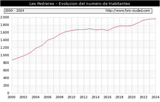 Segun los datos publicados por el INE a 1 de Enero de 2024 el numero de habitantes en Les Pedreres era de 1.972, 10 habitantes mas que el en el año 2023. En el grafico siguiente se puede ver cuantos habitantes tiene Les Pedreres a lo largo de los años.