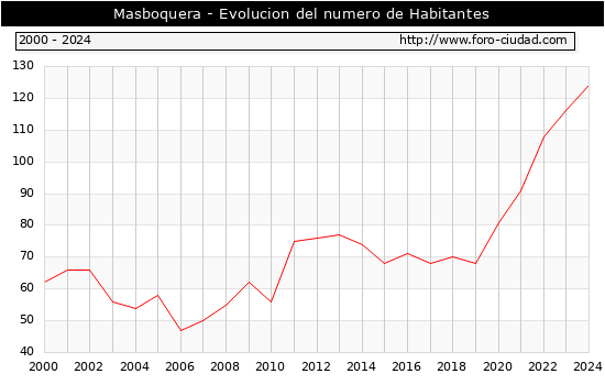 Segun los datos publicados por el INE a 1 de Enero de 2024 el numero de habitantes en Masboquera era de 124, 8 habitantes mas que el en el año 2023. En el grafico siguiente se puede ver cuantos habitantes tiene Masboquera a lo largo de los años.