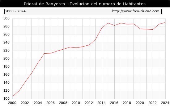 el numero de habitantes en Priorat de Banyeres era de 291, 5 habitantes mas que el en el año 2023. En el grafico siguiente se puede ver cuantos habitantes tiene Priorat de Banyeres a lo largo de los años.