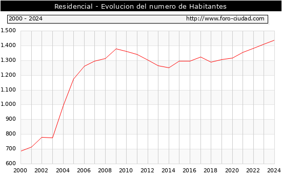 el numero de habitantes en Residencial era de 1.439, 29 habitantes mas que el en el año 2023. En el grafico siguiente se puede ver cuantos habitantes tiene Residencial a lo largo de los años.
