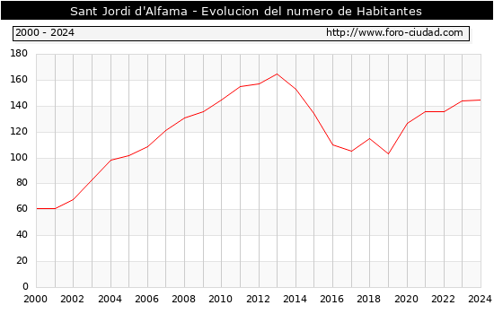 el numero de habitantes en Sant Jordi d'Alfama era de 145, 1 habitantes mas que el en el año 2023. En el grafico siguiente se puede ver cuantos habitantes tiene Sant Jordi d'Alfama a lo largo de los años.