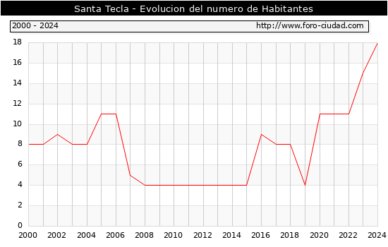 Segun los datos publicados por el INE a 1 de Enero de 2024 el numero de habitantes en Santa Tecla era de 18, 3 habitantes mas que el en el año 2023. En el grafico siguiente se puede ver cuantos habitantes tiene Santa Tecla a lo largo de los años.