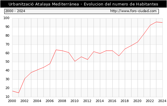 el numero de habitantes en Urbanitzaciķ Atalaya Mediterrānea era de 95, 1 habitantes menos que el en el aņo 2023. En el grafico siguiente se puede ver cuantos habitantes tiene Urbanitzaciķ Atalaya Mediterrānea a lo largo de los aņos.