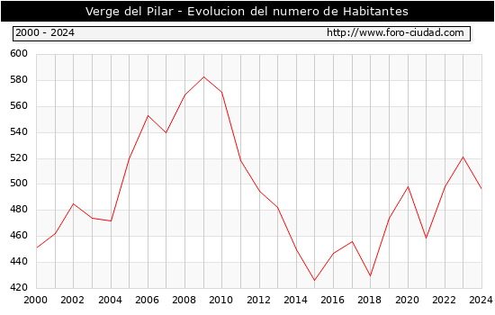 el numero de habitantes en Verge del Pilar era de 496, 25 habitantes menos que el en el año 2023. En el grafico siguiente se puede ver cuantos habitantes tiene Verge del Pilar a lo largo de los años.