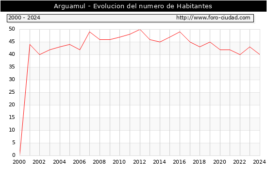 el numero de habitantes en Arguamul era de 40, 3 habitantes menos que el en el año 2023. En el grafico siguiente se puede ver cuantos habitantes tiene Arguamul a lo largo de los años.