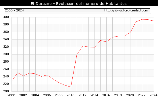 el numero de habitantes en El Durazno era de 390, 4 habitantes menos que el en el año 2023. En el grafico siguiente se puede ver cuantos habitantes tiene El Durazno a lo largo de los años.