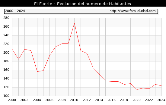 el numero de habitantes en El Fuerte era de 124, 3 habitantes menos que el en el año 2023. En el grafico siguiente se puede ver cuantos habitantes tiene El Fuerte a lo largo de los años.