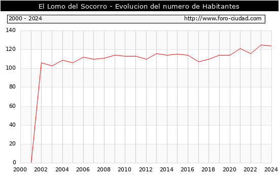 el numero de habitantes en El Lomo del Socorro era de 124, 1 habitantes menos que el en el año 2023. En el grafico siguiente se puede ver cuantos habitantes tiene El Lomo del Socorro a lo largo de los años.