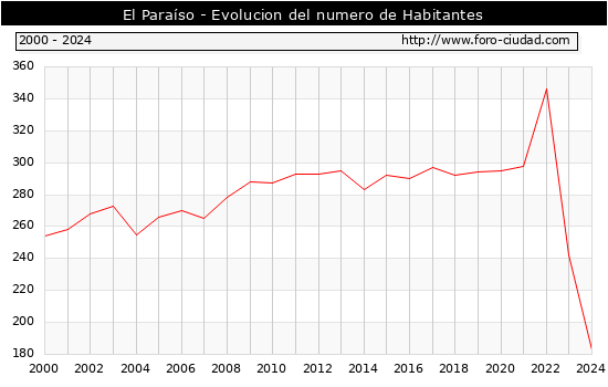el numero de habitantes en El Paraíso era de 183, 59 habitantes menos que el en el año 2023. En el grafico siguiente se puede ver cuantos habitantes tiene El Paraíso a lo largo de los años.