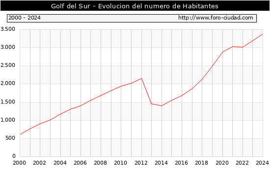 el numero de habitantes en Golf del Sur era de 3.382, 197 habitantes mas que el en el año 2023. En el grafico siguiente se puede ver cuantos habitantes tiene Golf del Sur a lo largo de los años.