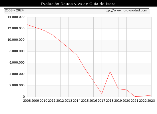 Guía de Isora - Deuda viva del Ayuntamiento a 31/12/2024 Guía de Isora - Deuda viva del Ayuntamiento a 31/12/2024 Segun el Ministerio de Economia y Hacienda el Ayuntamiento de Guía de Isora a 31/12/2024 posee una deuda de 8.000 € . La deuda viva a 31/12/2023 ascendia a 357.000 € por lo que en el ultimo año la deuda se redujo en -349.000 €. ![]()