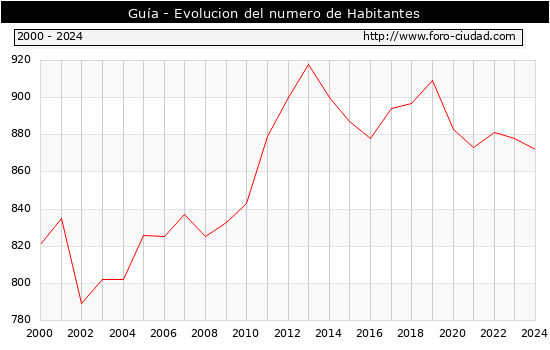 el numero de habitantes en Guía era de 872, 6 habitantes menos que el en el año 2023. En el grafico siguiente se puede ver cuantos habitantes tiene Guía a lo largo de los años.