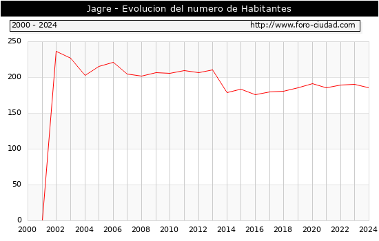 el numero de habitantes en Jagre era de 186, 4 habitantes menos que el en el año 2023. En el grafico siguiente se puede ver cuantos habitantes tiene Jagre a lo largo de los años.