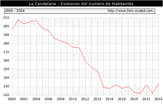 el numero de habitantes en La Candelaria era de 134, 12 habitantes mas que el en el año 2023. En el grafico siguiente se puede ver cuantos habitantes tiene La Candelaria a lo largo de los años.