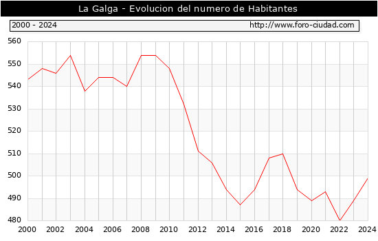 el numero de habitantes en La Galga era de 499, 10 habitantes mas que el en el año 2023. En el grafico siguiente se puede ver cuantos habitantes tiene La Galga a lo largo de los años.