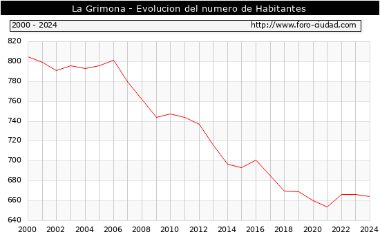 el numero de habitantes en La Grimona era de 664, 2 habitantes menos que el en el año 2023. En el grafico siguiente se puede ver cuantos habitantes tiene La Grimona a lo largo de los años.