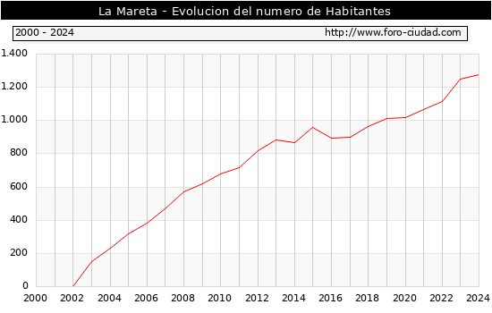 el numero de habitantes en La Mareta era de 1.276, 27 habitantes mas que el en el año 2023. En el grafico siguiente se puede ver cuantos habitantes tiene La Mareta a lo largo de los años.