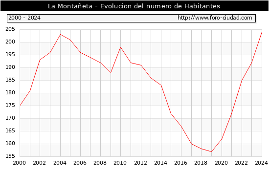 el numero de habitantes en La Montañeta era de 204, 12 habitantes mas que el en el año 2023. En el grafico siguiente se puede ver cuantos habitantes tiene La Montañeta a lo largo de los años.