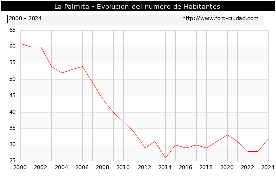 el numero de habitantes en La Palmita era de 32, 4 habitantes mas que el en el año 2023. En el grafico siguiente se puede ver cuantos habitantes tiene La Palmita a lo largo de los años.