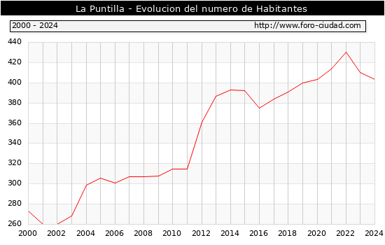 el numero de habitantes en La Puntilla era de 403, 7 habitantes menos que el en el año 2023. En el grafico siguiente se puede ver cuantos habitantes tiene La Puntilla a lo largo de los años.