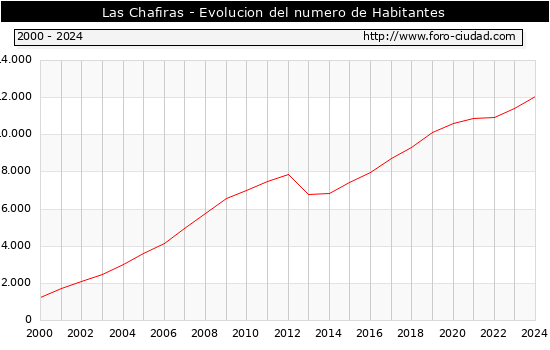 el numero de habitantes en Las Chafiras era de 12.037, 609 habitantes mas que el en el año 2023. En el grafico siguiente se puede ver cuantos habitantes tiene Las Chafiras a lo largo de los años.