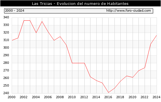 el numero de habitantes en Las Tricias era de 317, 12 habitantes mas que el en el año 2023. En el grafico siguiente se puede ver cuantos habitantes tiene Las Tricias a lo largo de los años.