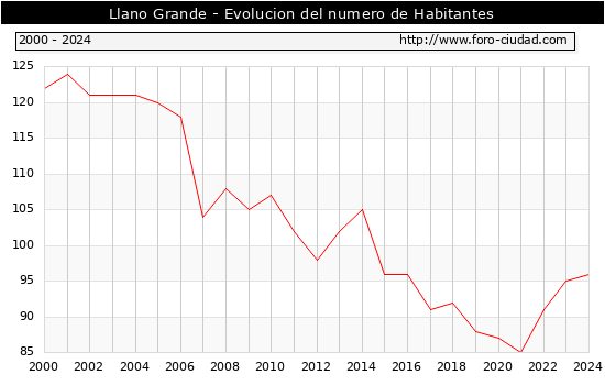 el numero de habitantes en Llano Grande era de 96, 1 habitantes mas que el en el año 2023. En el grafico siguiente se puede ver cuantos habitantes tiene Llano Grande a lo largo de los años.