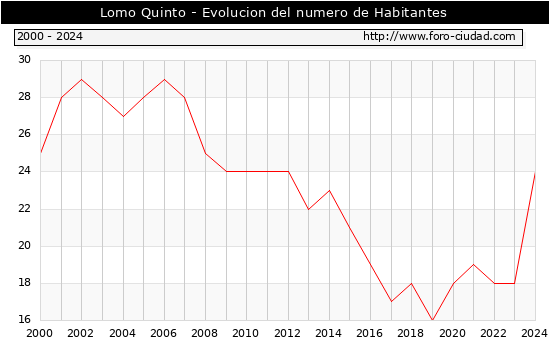 el numero de habitantes en Lomo Quinto era de 24, 6 habitantes mas que el en el año 2023. En el grafico siguiente se puede ver cuantos habitantes tiene Lomo Quinto a lo largo de los años.