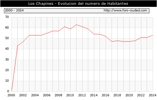el numero de habitantes en Los Chapines era de 53, 2 habitantes mas que el en el año 2023. En el grafico siguiente se puede ver cuantos habitantes tiene Los Chapines a lo largo de los años.